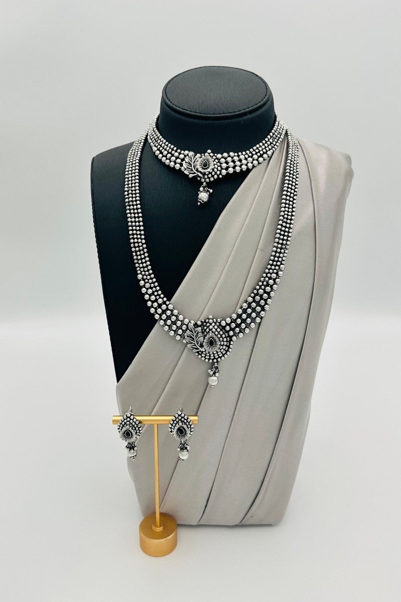 Versatile Oxidised Silver Long and Short Combo Necklace Set with Earrings. - swadeshsouq.com