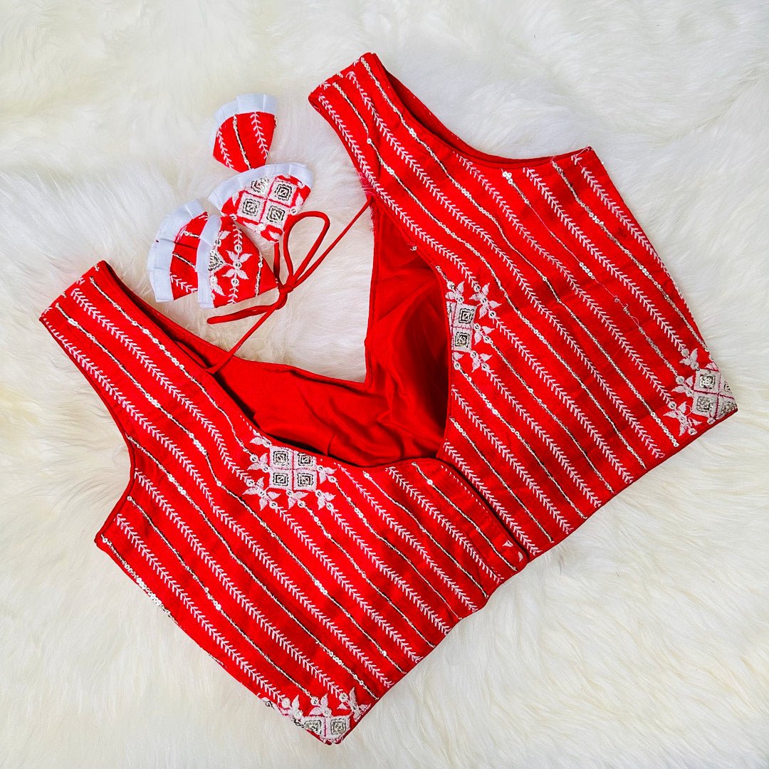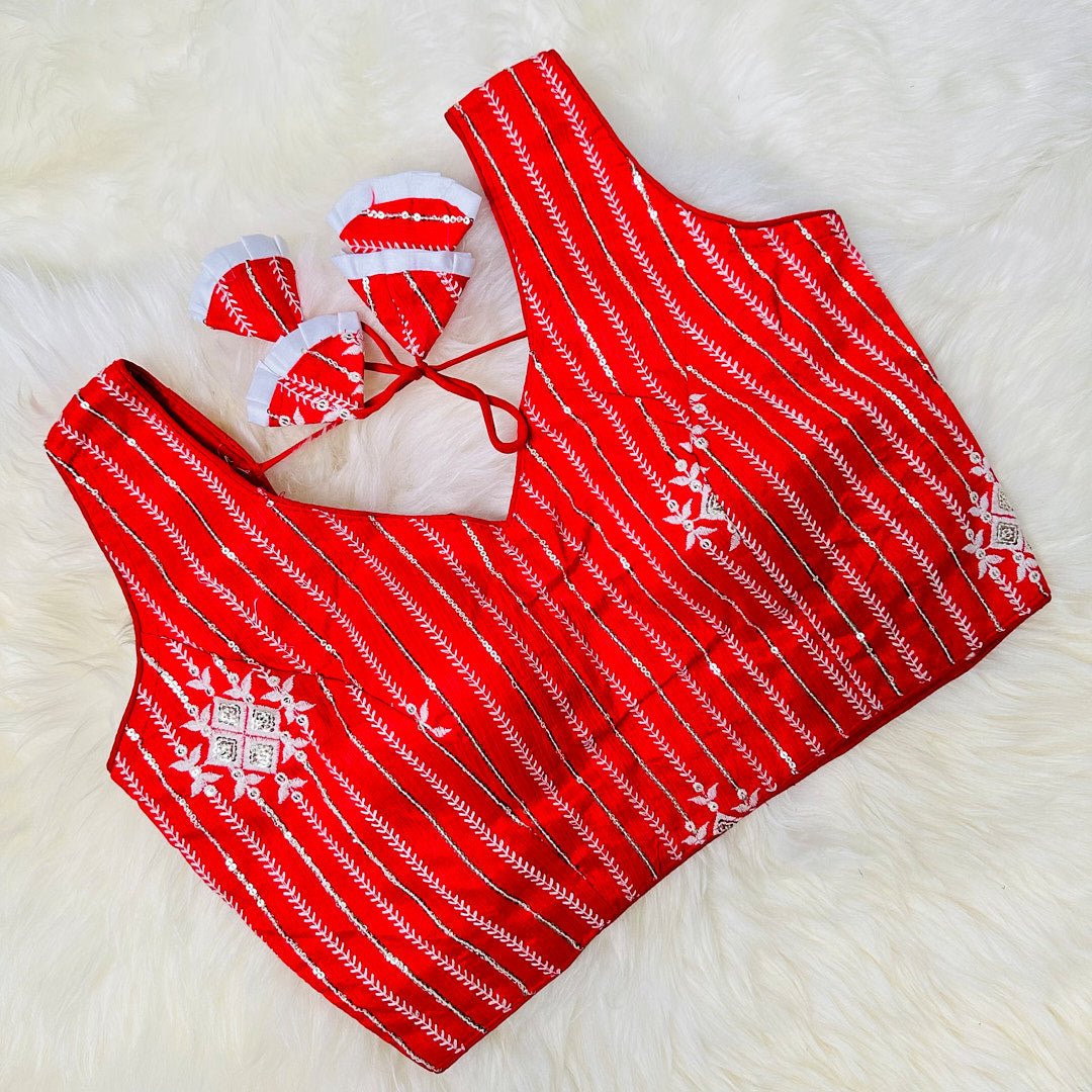 This gorgeous red raw silk blouse with full embroidery is a stunning addition to any wardrobe. The intricate embroidery work on the blouse, in a blend of traditional and modern design, makes it perfect for any formal event or festive occasion. The included sleeves make it even more versatile. Make a bold statement and exude confidence with this eye-catching red blouse.
