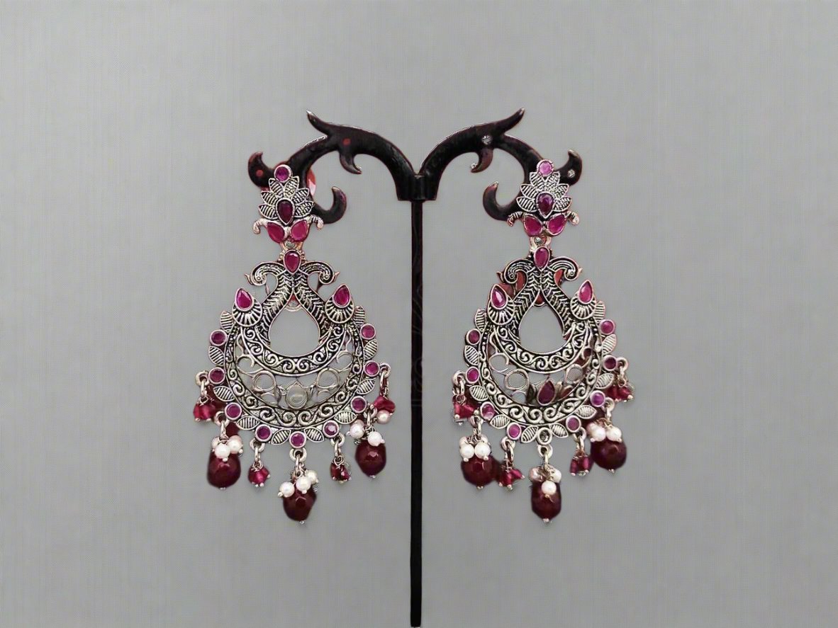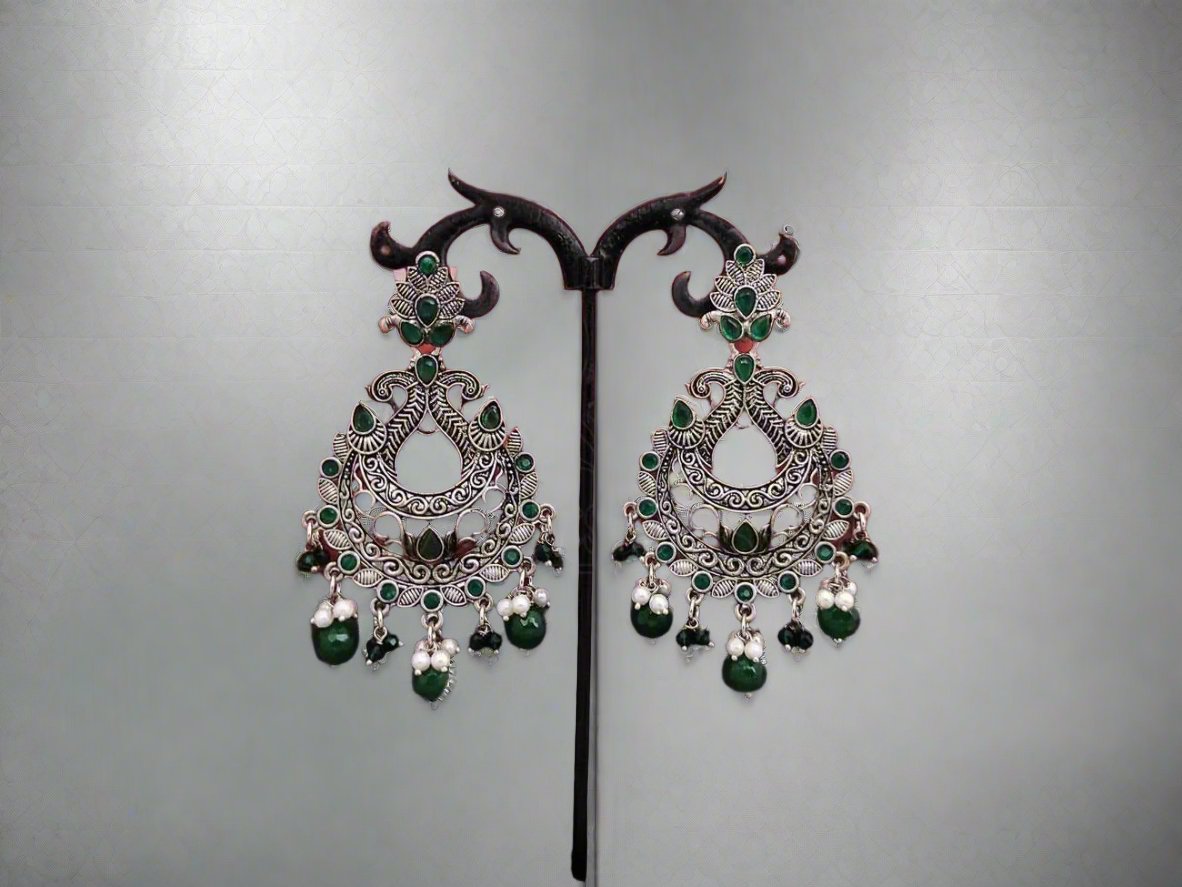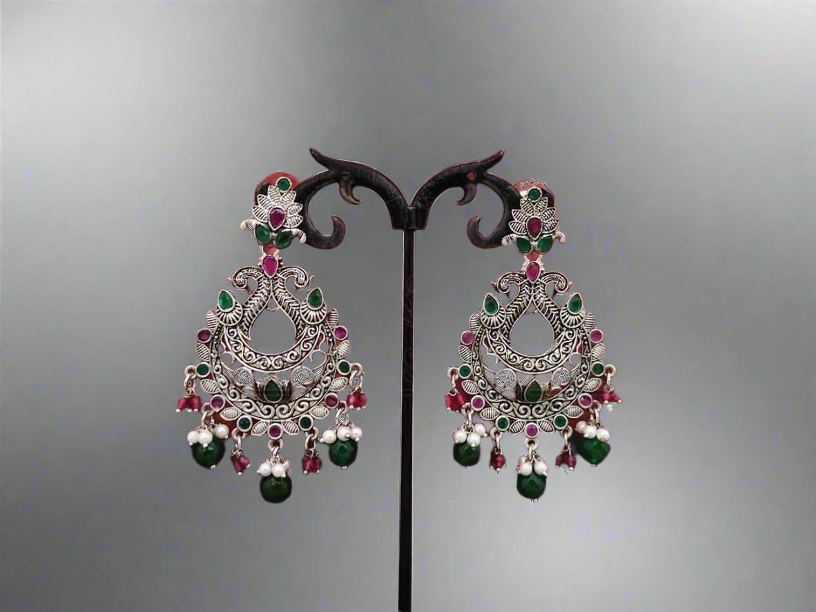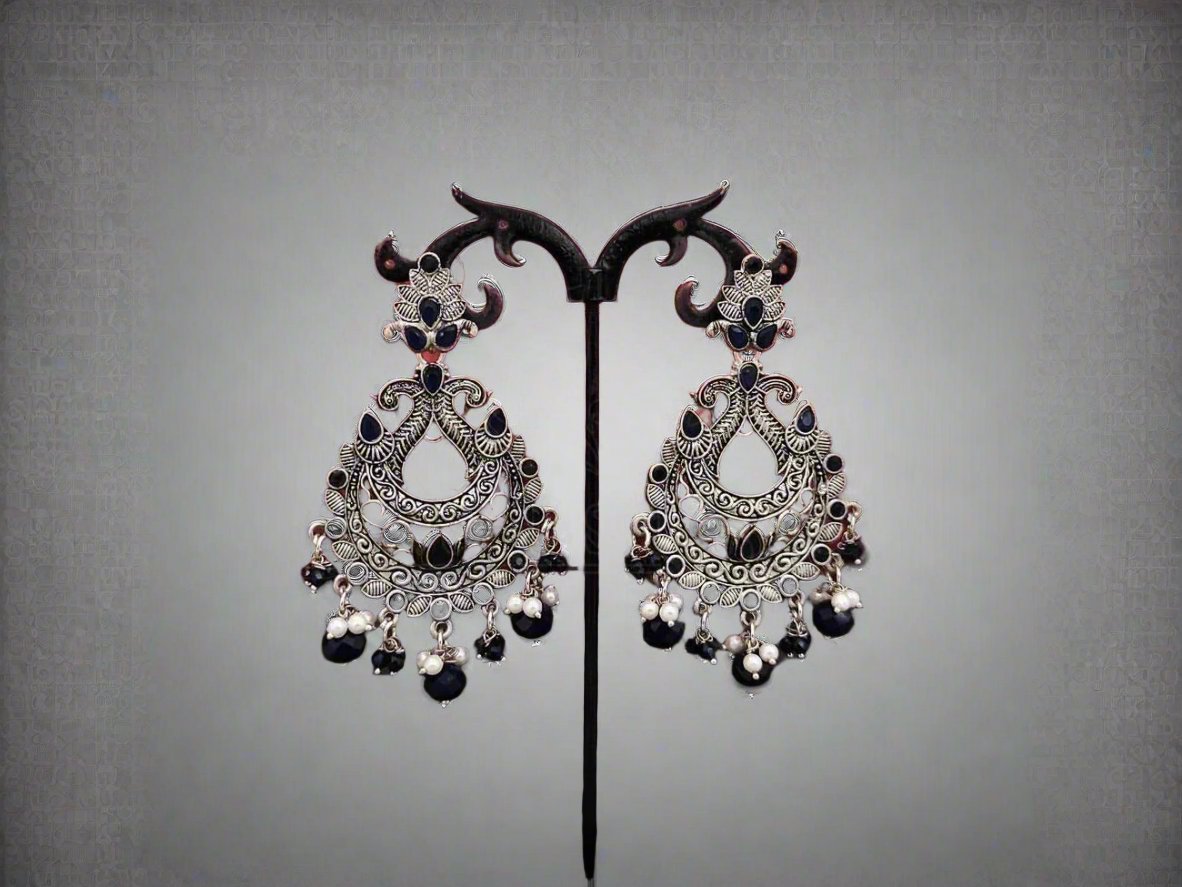 These oxidised silver chandbali earrings exude a vintage charm and are a masterpiece of traditional Indian jewellery. The intricate detailing and skilled craftsmanship that went into their creation are apparent in every curve and design element. Embellished with luminous pearls and sparkling stones, these earrings are the perfect accessory to add a touch of glamour to any outfit. The oxidised silver adds a unique and rustic touch to the intricate design of these chandbalis, making them a versatile accessory that can be worn with both traditional and contemporary attire. These chandbali earrings are a true symbol of elegance and grace, a testament to the beauty and artistry of Indian jewellery.
