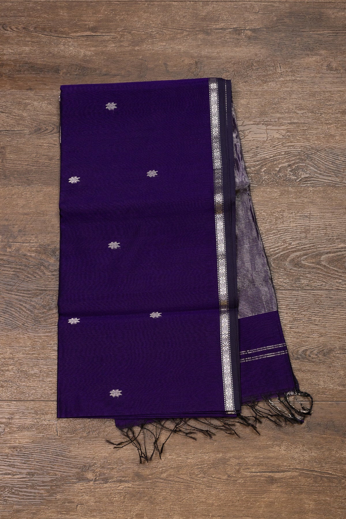 Unveil your elegance with this exquisite Maheshwari silk-cotton saree in a captivating shade of violet. Enhanced by shimmering silver sheer buttis, this saree is a perfect blend of tradition and glamour. Handwoven with precision, it is the epitome of luxurious comfort and timeless beauty.